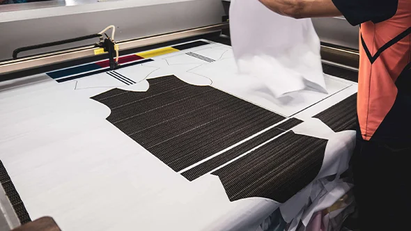 After sourcing, the fabric is cut down into pieces according to the patterns. After that, according to our client's requirements, these pieces have printing or embroidery.